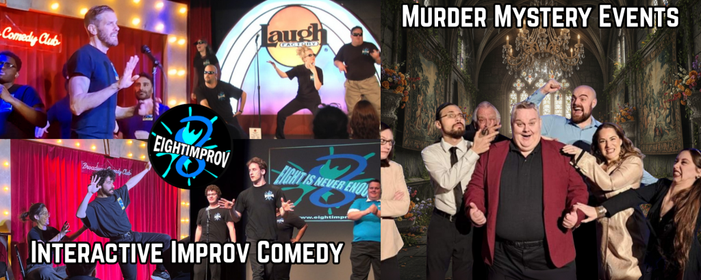 - Improv by EIGHT: Our Signature improv shows bring musical comedy, immersive games and great comedic theater to any event. We famously promote PG13 comedy. We stay smart and relevant. We flirt on the edge while remaining friendly for the office, college campus, church/temple, and even all ages family events. Our main stage show features five actors. It lasts about 75 minutes. We also have smaller shows for more intimate settings. We have performed over 8000 shows in 20+ years, mostly due to rebookings year after year.