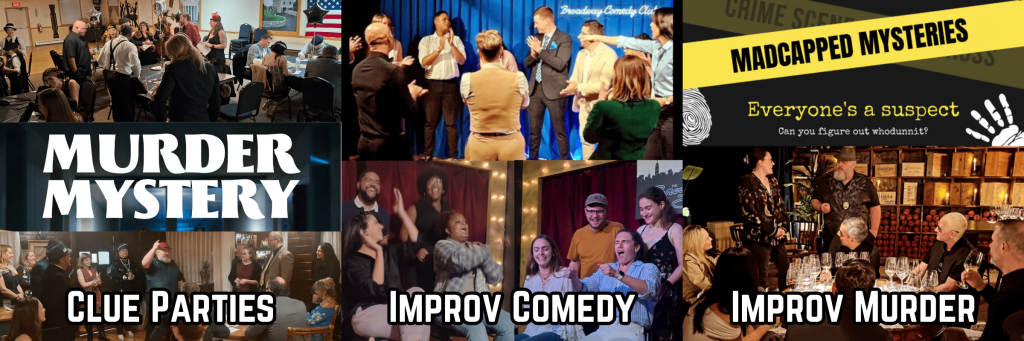 - MADCAPPED MYSTERIES is the most original murder mystery show EVER! Madcapped is also my #1 selling show for the past 18 months. For one, getting a murder mystery experience this good for $600 or less is almost unthinkable. We have amazing rates for libraries and other non-profits. Two, this show leads to more re-booking than anything I have ever produced, other than EIGHT IMPROV. After EVERY show 2-3 or more approach me for my card. “I HAVE TO HAVE THIS AT MY NEXT EVENT!”