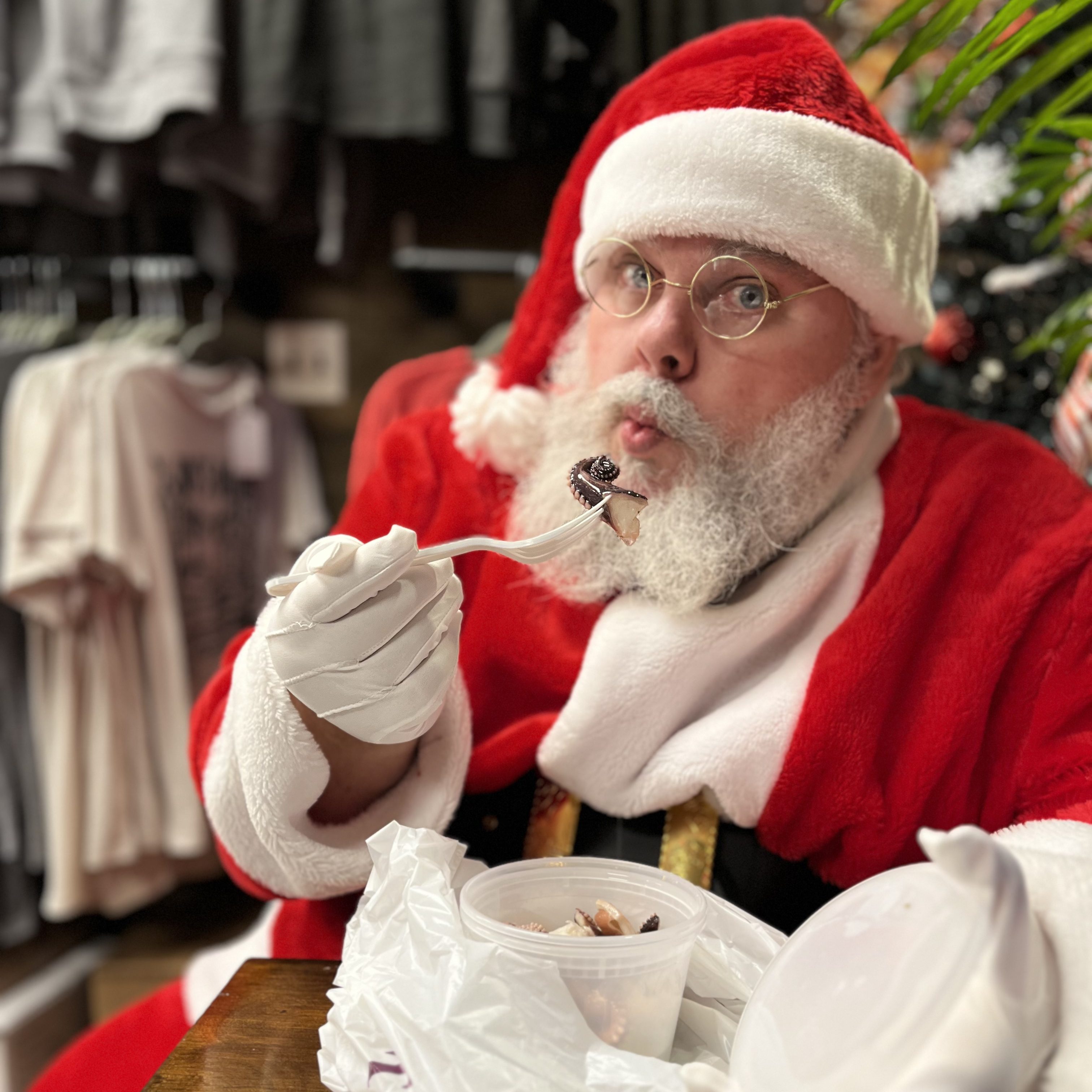 Santa enjoying octopus salad at Joe’s Deli, Arthur Ave, Bronx Little Italy