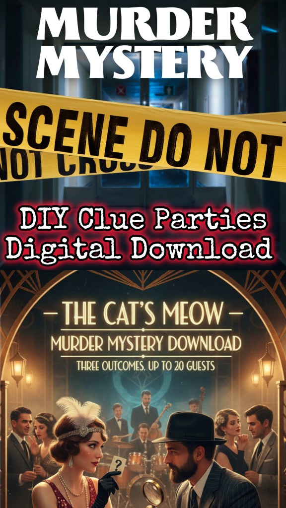 Run a party yourself with our new DIY Clue Party Kit Digital Download. 1920’s Speakeasy Murder Mystery Game is now ready. Order now, print today, host tonight!